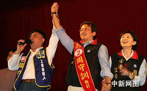 一月十日晚,臺(tái)北市市長(zhǎng)郝龍斌(左)為“立委”候選人周守訓(xùn)參選拉票造勢(shì)。 作者:孫自法