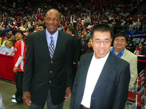 火箭隊(duì)“滑翔機(jī)”得雷克斯勒(右)見到老朋友王寧后特別高興。美國(guó)《明橋體育》供圖 / 許陽 言心 攝影