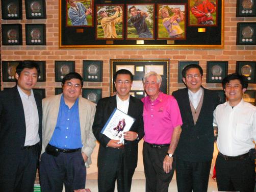 王寧部長(zhǎng)(左3)在《明橋體育》負(fù)責(zé)人和當(dāng)?shù)刂A人企業(yè)家郭翔的陪同下,拜訪六十年代國(guó)際著名的高爾夫球星道格-桑德斯(右3),并邀請(qǐng)他到中國(guó)去訪問。美國(guó)《明橋體育》供圖 / 許陽 言心 攝影