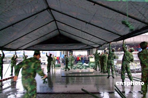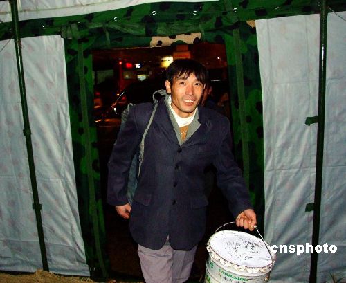 1月27日,南京軍區(qū)“硬骨頭六連”所在師接到杭州市政府請求支援電話,派出200余名工兵,火速趕往杭州火車站。官兵們寒著風雪嚴寒,很快搭設好12頂野戰(zhàn)帳篷,并在帳篷里鋪設了草墊子,為滯留旅客提供休息之地。滯留在車站的民工旅客走進野戰(zhàn)帳篷,臉上露出笑容,高興地說:今晚不會挨凍了,感謝黨和人民解放軍。據(jù)車站負責人介紹,因冰雪天氣影響,這天約有2萬名旅客滯留杭州火車站。中新社發(fā) 邱柏星 攝