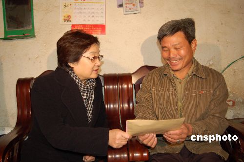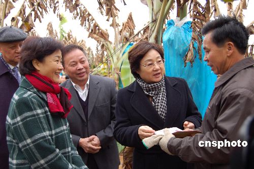 2月3日上午,中國國務(wù)院僑辦主任李海峰女士一行到遭受冰凍災(zāi)害的廣西南寧隆安縣浪灣華僑農(nóng)場,考察災(zāi)情,慰問受災(zāi)歸僑。李海峰還代表國務(wù)院僑辦和海外僑胞,向該農(nóng)場災(zāi)民捐贈三萬元人民幣。此前2月2日晚,國僑辦“僑愛溫暖行動”向廣西捐贈一百萬元人民幣。中新社發(fā) 劉萬強 攝