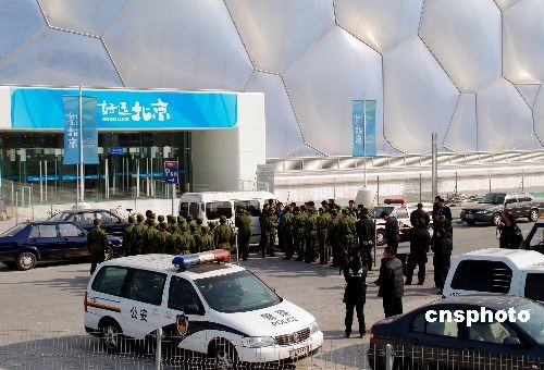 圖:北京“水立方”賽前加強(qiáng)安檢