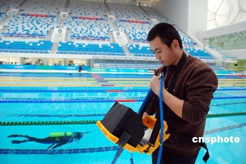 安檢人員用水下目鏡儀檢查北京奧運(yùn)場(chǎng)館“水立方”水下設(shè)施。