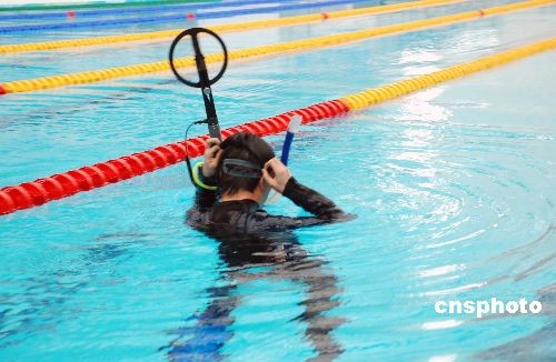 一名警察在對(duì)北京奧運(yùn)場(chǎng)館“水立方”水底設(shè)施實(shí)施防爆安全檢查。