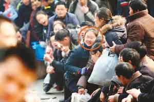 回到隊伍末端,瘦小男子只得重新排隊。他一臉無辜的自稱涪陵區(qū)人,名叫孫文件,在天津打工,從13日便開始候票。孫先生告訴記者,排在隊伍前面的一半左右的人都是票販子。他說,之所以這么肯定這些插隊的人是票販子,是因為他認(rèn)得其中一個,那個人13日下午向他兜售過到北京的硬坐車票,加價250元,他沒敢要。