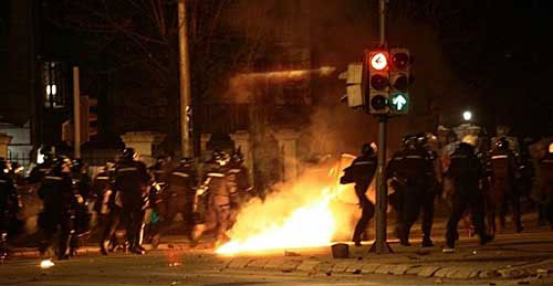 大約一千名憤怒的塞族青年,到美國大使館、一間美式快餐店和歐盟輪任主席國斯洛文尼亞大使館投擲石塊,并與防暴警察沖突,示威者又拆去歐盟旗幟,示威者又縱火、燒車,打爛大使館的玻璃窗。防暴警察以催激氣體及橡膠子彈驅散,又施放催淚氣體和出動警棍驅散。