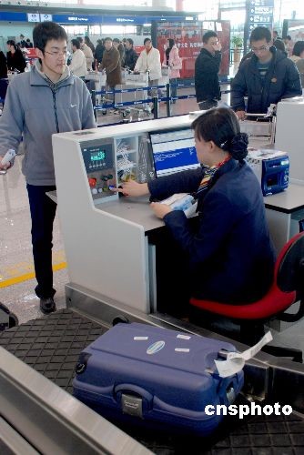 圖為機場工作人員正在為“旅客”辦理托運服務。