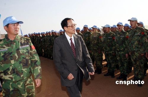 2月26日,中國政府達(dá)爾富爾問題特別代表劉貴今來到中國維和多功能工兵分隊(duì)慰問,中國維和工兵分隊(duì)是首個(gè)非洲之外國家派遣的維和部隊(duì),他們近日已搬進(jìn)位于蘇丹南達(dá)爾富爾的營地。中新社發(fā) 李鵬 攝