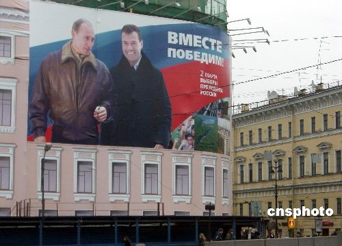 3月1日,在莫斯科紅場旁邊,現(xiàn)任俄羅斯總統(tǒng)普京與政府第一副總理、下屆總統(tǒng)的熱門侯選人梅德韋杰夫的巨幅海報(bào),上書“我們攜手贏取勝利”十分醒目。梅德韋杰夫曾多次表示,他若當(dāng)選后將繼續(xù)執(zhí)行普京路線。3月2日,俄羅斯將舉行總統(tǒng)大選。中新社發(fā) 田冰 攝