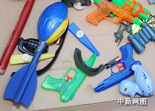 紙盒內(nèi)的“導彈”、“槍械”----它們都是兒童塑料玩具。