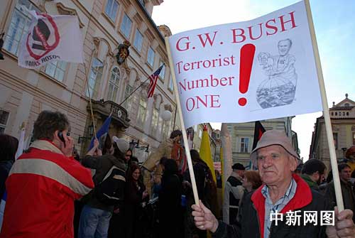 一位示威者在美國大使館前面舉著“布什是頭號恐怖分子”的標語牌。