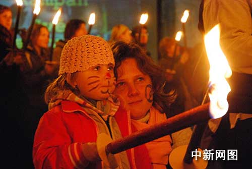 一對母女3月15日晚上在捷克首都布拉格和平廣場上舉行的要求外國軍隊撤出伊拉克的反戰(zhàn)火炬集會上。