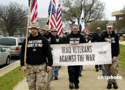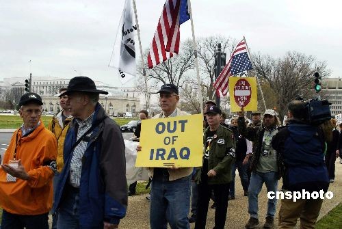 3月19日,在伊拉克戰(zhàn)爭爆發(fā)五周年的日子里,美國華盛頓國會山前聚集了大批反戰(zhàn)示威人群。一些示威者呼喊反戰(zhàn)口號,呼吁美軍“撤出伊拉克”。中新社發(fā) 邱江波 攝