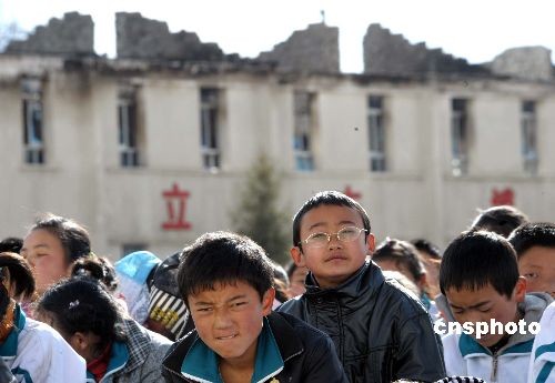 3月21日,拉薩二中的中學(xué)生在被焚毀的教室前集會(huì)控訴不法分子罪行。