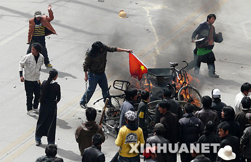 3月14日,一群不法分子在西藏自治區(qū)首府拉薩市區(qū)的主要路段實(shí)施打砸搶燒,焚燒過往車輛,追打過路群眾,沖擊商場、電信營業(yè)網(wǎng)點(diǎn)和政府機(jī)關(guān),給當(dāng)?shù)厝嗣袢罕娚?cái)產(chǎn)造成重大損失,使當(dāng)?shù)氐纳鐣刃蚴艿搅藝?yán)重破壞。事后查明,這天,不法分子縱火300余處,拉薩908戶商鋪、7所學(xué)校、120間民房、5座醫(yī)院受損,砸毀金融網(wǎng)點(diǎn)10個(gè),至少20處建筑物被燒成廢墟,84輛汽車被毀。有18名無辜群眾被燒死或砍死,受傷群眾達(dá)382人,其中重傷58人。拉薩市直接財(cái)產(chǎn)損失達(dá)24468.789萬元。