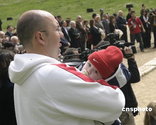 當(dāng)?shù)貢r(shí)間3月23日,北京奧運(yùn)圣火采集最后一次彩排在希臘古奧林匹亞遺址舉行,一位父親懷抱不到半歲的嬰兒觀看采集儀式。中新社發(fā) 王歡 攝