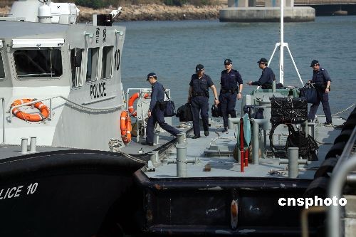 三月二十四日﹐參加香港海域嚴(yán)重撞船意外的海警隊(duì)員整裝待發(fā)。二十二日晚﹐香港國際機(jī)場以東的大小磨刀洲海面發(fā)生嚴(yán)重撞船意外,一艘烏克蘭注冊的油田補(bǔ)給船與一艘內(nèi)地貨船相撞﹐補(bǔ)給船迅速翻沉﹐七名船員獲救﹐十八名烏克蘭船員隨船一并沉落在三十七米海底﹐至今下落不明。中新社發(fā) 武仲林 攝