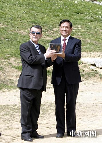 希臘當(dāng)?shù)貢r間3月24日,北京二00八年奧運(yùn)會圣火采集儀式在古奧林匹亞競技場舉行。北京奧組委主席劉淇接受希臘奧委會主席的贈禮。 中新社記者 王歡
