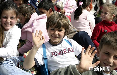 希臘當(dāng)?shù)貢r間3月24日,北京二00八年奧運會圣火采集儀式在古奧林匹亞競技場舉行。希臘小觀眾坐在草坪上觀看采集儀式。 中新社記者 王歡