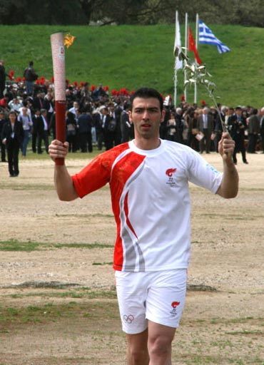 當(dāng)?shù)貢r(shí)間二十四日上午十一時(shí)四十八分,北京奧運(yùn)圣火在古奧林匹克遺址點(diǎn)燃。最高女祭司在古奧林匹克競(jìng)技場(chǎng)入口處點(diǎn)燃第一名火炬手、曾獲雅典奧運(yùn)銀牌的希臘跆拳道運(yùn)動(dòng)員亞歷山大·尼克拉澤斯手中的火炬,同時(shí)將橄欖枝傳遞給他。亞歷山大舉起第一支燃燒的“祥云”火炬,開(kāi)啟了北京奧運(yùn)“點(diǎn)燃激情、傳遞夢(mèng)想”的火炬?zhèn)鬟f旅程。