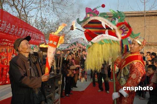 2008年3月24日,奧運圣火采集儀式在希臘隆重舉行的同時,山東省棗莊市市中區(qū)齊村鎮(zhèn)柏山村的農民們,在村里的千年老槐樹下以當?shù)刈顐鹘y(tǒng)的方式模擬了圣火采集過程。中新社發(fā) 張大東 攝
