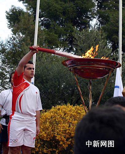 3月25日,北京2008年奧運(yùn)圣火希臘傳遞第二天,慶典儀式在終點(diǎn)約阿尼納舉行。最后一棒火炬手點(diǎn)燃圣火盆,圣火將被盛放在圣火盆中在此停留一晚。 中新社記者 王歡