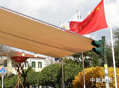 3月25日,北京2008年奧運(yùn)圣火希臘傳遞第二天,慶典儀式在終點(diǎn)約阿尼納舉行。存放北京奧運(yùn)圣火的圣火盆架在國(guó)旗下。中新社記者 王歡