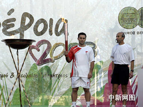 3月26日,北京奧運(yùn)會(huì)圣火希臘境內(nèi)傳遞第三日,抵達(dá)當(dāng)天最后一個(gè)城市韋里亞。最后一位火炬手希臘手球運(yùn)動(dòng)員吉米多斯點(diǎn)燃了圣火盆。中新社記者 王歡