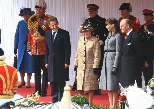 法國(guó)總統(tǒng)薩科齊與新婚夫人布魯尼抵達(dá)倫敦,開(kāi)始其首次對(duì)英國(guó)的國(guó)事訪問(wèn)。當(dāng)?shù)貢r(shí)間26日中午,英國(guó)女王伊麗莎白二世在溫莎城堡舉行儀式,歡迎薩科奇到訪。圖中前自左至右分別為薩科奇、伊麗莎白二世、布魯尼、菲利普親王。中新社發(fā) 李鵬 攝