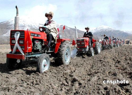 3月26日,拉薩市達(dá)孜縣德慶鎮(zhèn)桑珠村的農(nóng)牧民們穿上節(jié)日盛裝,用政府新支援的拖拉機(jī)開始春耕生產(chǎn)。藏族農(nóng)牧民一年一度的春耕并沒有受到拉薩“3.14”打、砸、搶、燒暴力事件的影響。中新社發(fā) 周波 攝