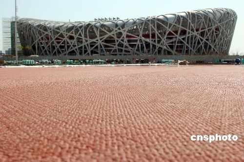 圖:奧運“鳥巢”熱身場地塑膠跑道鋪設(shè)基本完成