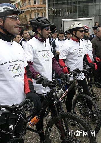 3月27日,北京奧運(yùn)圣火希臘境內(nèi)傳遞第四天,山城納烏薩迎來第一個(gè)慶典儀式。山地自行車手準(zhǔn)備護(hù)送奧運(yùn)圣火離開。中新社記者:王歡