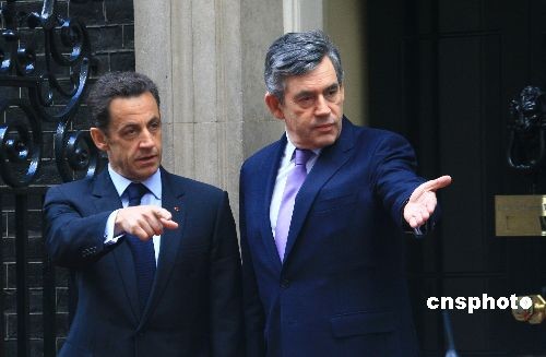 圖為布朗(右)和薩科奇會見后準備離開,前往出席英法高峰會。中新社發(fā) 李鵬 攝