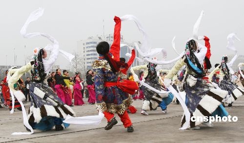2008年3月29日,在北京雕塑公園西側(cè)廣場,由北京市文化局組織的廣場文藝演出正在緊張排練中。由兒童、中學(xué)生、大學(xué)生、年輕人到六七十歲的老人們組成的幾個演出板塊,都是為了3月31日參加天安門廣場的迎接奧運圣火演出。為了迎接那最圣神的一天到來,演員們正緊張有序地排練著。
