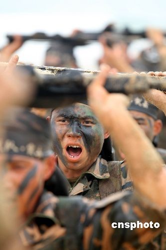 圖為中國陸戰(zhàn)隊(duì)員進(jìn)行沙灘體能訓(xùn)練。中新社發(fā) 李唐 攝