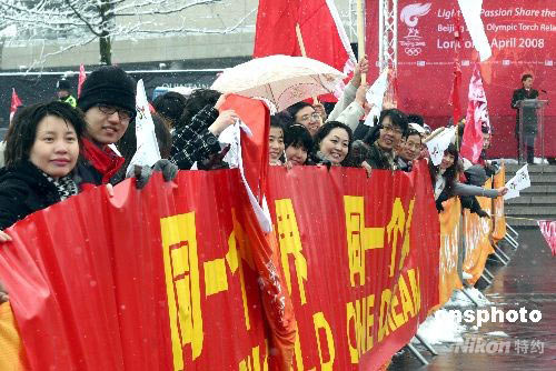 倫敦是北京奧運(yùn)圣火境外傳遞過程中,傳遞路線最長(zhǎng)、最復(fù)雜的城市。約八個(gè)半小時(shí)的圣火傳遞,包括了輪船、自行車、敞篷公共汽車、輕軌等四種特殊傳遞方式。圖為中國(guó)留學(xué)生在溫布利體育場(chǎng)外為奧運(yùn)圣火助威。 沈晨 攝