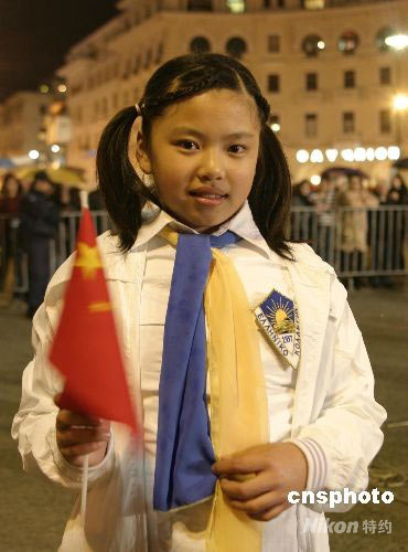 希臘當(dāng)?shù)貢r(shí)間3月27日,北京奧運(yùn)圣火希臘境內(nèi)第四天傳遞,在當(dāng)天的終點(diǎn)塞薩洛尼基舉行慶典儀式。圖為童聲合唱團(tuán)中唯一的華人女孩王佩珺。 王歡 攝
