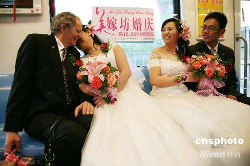 4月19日,新人們準(zhǔn)備乘坐南京地鐵“婚車專列”。當(dāng)日,南京舉辦“幸福長城2008”地鐵集體婚禮,12對新人在行進中的南京地鐵“婚車專列”上喜結(jié)良緣,讓其他乘客一道共同感受甜蜜喜慶的氣氛,分享他們的幸福時光。中新社發(fā) 鐘山 攝