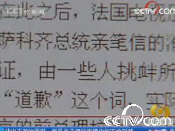 法國電視足足花了7分多鐘的時(shí)間報(bào)道與中國有關(guān)的4條消息。首先是法國參議院議長向金晶轉(zhuǎn)交薩科齊總統(tǒng)親筆信的消息。破天荒地在屏幕上打出薩卡奇信件的一句關(guān)鍵的話:“我在此向您保證,由一些人挑釁所引起的事件并不反映我的同胞們對(duì)中國人民的情感”。主持人說,雖然沒有明說“道歉”這個(gè)詞,實(shí)際上現(xiàn)在是法國人道歉尋求和解的時(shí)候了。