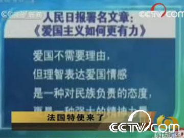 在北京,法國電視二臺(tái)記者現(xiàn)場調(diào)查抵制家樂福的呼吁到底有多大影響,詢問一位剛從家樂福出來的中國消費(fèi)者對(duì)抵制家樂福的看法,這位男士一邊往車?yán)镅b采購袋一邊說:“應(yīng)該抵制啊,要是法國是我們的朋友,為什么巴黎圣火會(huì)出這么多的事”。記者還找到了一位反對(duì)抵制的女士,這位年輕的女子說:“我反對(duì)抵制,這對(duì)中國的形象不好”、“賣的好多東西都是中國產(chǎn)品”。然后鏡頭一轉(zhuǎn),法國新聞聯(lián)播居然切入了中國央視新聞聯(lián)播的鏡頭:人民日?qǐng)?bào)發(fā)表文章《愛國主義如何更有力》。