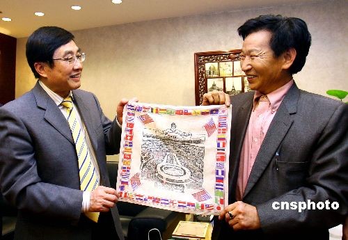 4月29日,美籍華人喬文安(右)在上海向中國2010年上海世博會組織者捐贈具有百年歷史的國際博覽會絲綢紀念品等“世博會文物”,F(xiàn)場捐贈的文物之一是“1909年美國西雅圖市舉辦的阿拉斯加—尤康—太平洋博覽會絲綢紀念品”(如圖)。專家鑒定具有百年歷史的這一絲綢紀念品上繪有當時象征中國清政府的龍紋旌旗,是中國參與世界性博覽會的有力物證。自今年5月起,喬文安捐贈的“世博會文物”將在上海新辟的“世博會常年展示中心”公開展示。中新社發(fā) 世博局 攝