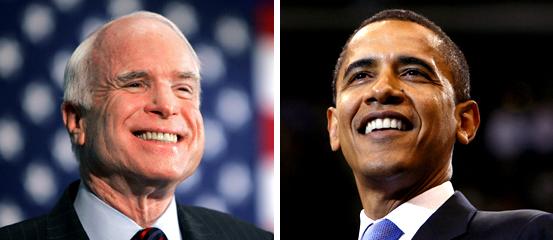 美國共和黨總統(tǒng)競選人麥凱恩(左)與民主黨總統(tǒng)競選人奧巴馬(右)。
