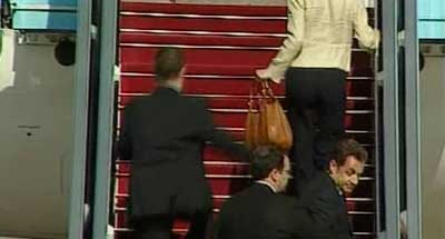 槍響之時,軍樂儀隊正在表演,賓主顯然都未聽到槍聲。身著暗色勁裝的男子迅即掩護(hù)薩科齊和妻子登上飛機(jī)扶梯。在慌亂中,薩科齊的妻子布呂尼花容失色,搶在丈夫前頭登機(jī)。