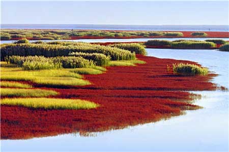 盤錦,地勢(shì)平坦,景觀獨(dú)特,資源豐富,可謂物華天寶,被稱作美麗、富饒的遼河金三角。距北京600多公里的遼寧盤錦有一片海灘,秋天一到,海邊的植物慢慢變紅,大片紅色鋪滿整個(gè)海灘,異常壯觀。