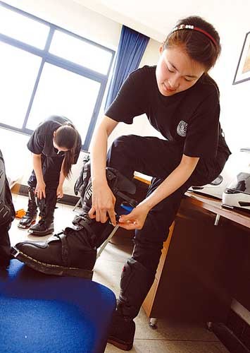 李亞麗穩(wěn)穩(wěn)當(dāng)當(dāng)?shù)伛{著摩托車圍著場地繞了一圈。那些從沒開過摩托車的姐妹們可就沒那么穩(wěn)當(dāng)了。25歲的“警花”甄珍,1米74的個(gè)頭,曾在警官樂團(tuán)擔(dān)任打擊樂聲部長,隨團(tuán)出訪日本參加世界警察音樂會(huì)。2002年從警校畢業(yè)后分配到車管所工作。性格開朗的她平時(shí)喜歡健身、看書、聽音樂。這次被調(diào)入帶路隊(duì),心里甭提多高興了,“騎著摩托車、頭戴耳麥?zhǔn)筋^盔、腳蹬馬靴、全身披掛著直接為奧運(yùn)會(huì)服務(wù),甭提多威武了!笨僧(dāng)她和女隊(duì)員們看到眼前這些自重都在500斤以上的大排量摩托車時(shí),卻傻了眼兒。這哪是摩托車呀,簡直是條船。