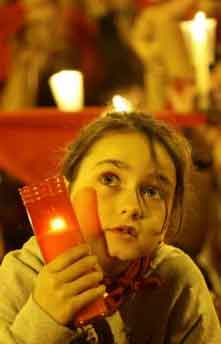 15日凌晨,一個(gè)小女孩手舉蠟燭參加西班牙奔牛節(jié)閉幕活動(dòng)。