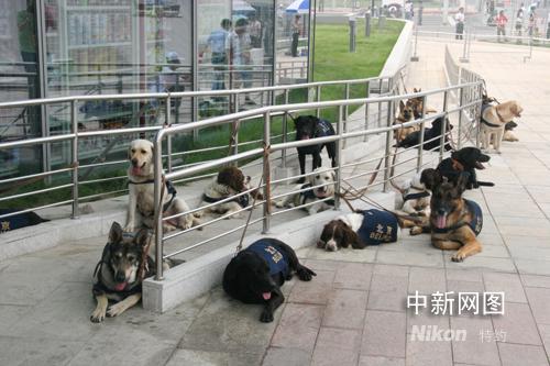 在主新聞中心門口等待排爆的警犬。攝影:宋方燦