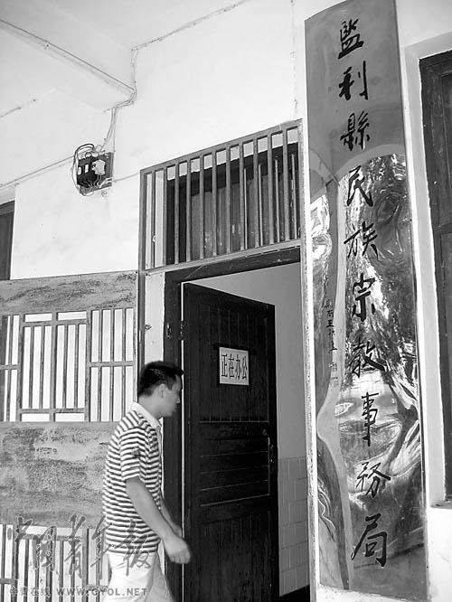 7月28日上午,記者輾轉(zhuǎn)找到監(jiān)利縣民族宗教事務(wù)局。該局辦公室門口一張落款日期為2007年10月的告示稱:“遵照省、市通知精神,停止辦理少數(shù)民族身份確認手續(xù)。”一位自稱剛剛借調(diào)來的工作人員介紹,這是因為當時來辦民族變更手續(xù)的人很多,“很煩,就在門口貼了這張公告!