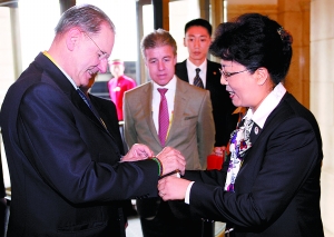 象征奧運五環(huán)的五色絲線上下翻飛,在一個個社區(qū)“巧娘”手中,一串串寓意吉祥、造型精美的中國結(jié)手鏈在奧運前夕趕制完畢。昨天,純手工編織的“吉祥鏈”戴到了國際奧委會主席羅格的手腕上。