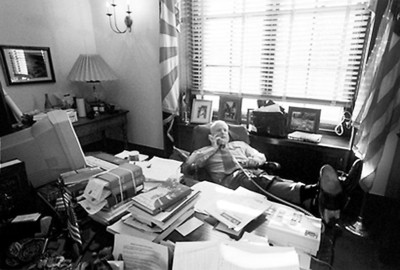 他的辦公桌面則活脫脫一間倉(cāng)庫(kù):一個(gè)貝利·高華德的搖頭公仔,一個(gè)泰迪·羅斯福的填充人偶,一個(gè)盛滿(mǎn)羽毛的杯子,一個(gè)帽子上寫(xiě)著“軍隊(duì)”二字的綠色巫婆填充玩偶,一條刻著在伊拉克戰(zhàn)死的某士兵名字的手鐲,以及數(shù)不清的碎紙、石頭、硬幣和曲別針。粘在桌子一角的簽語(yǔ)餅的小紙條很容易勾起人們的回憶,上面寫(xiě)著:“相比于金錢(qián)和成功,原則對(duì)你更重要。